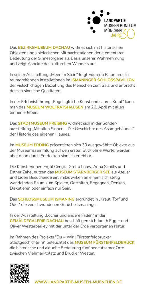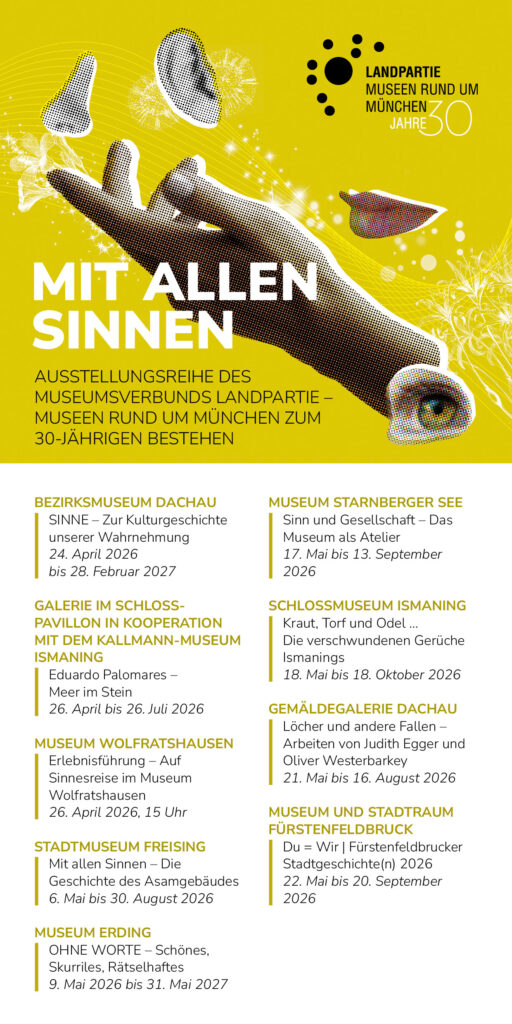 Das BEZIRKSMUSEUM DACHAU widmet sich mit historischen Objekten und spielerischen Mitmachstationen der elementaren Bedeutung der Sinnesorgane als Basis unserer Wahrnehmung und zeigt Aspekte des kulturellen Wandels auf.